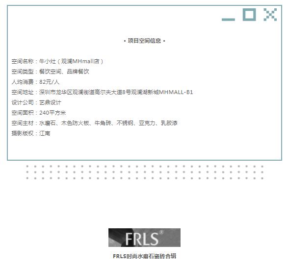 本案空間為長條形空間布局,Mo?意大利灰時尚水磨石的溫潤打底,在自然光和人工照明的配合下,具有的儀式感和藝術感。木色防火板提升空間溫度,牛角造型隔斷讓用餐變得精致有趣,不銹鋼配亞克力的架構則注入絲絲硬朗風,陣列的牛角磚更是空間和品牌文化的又一次呼應……